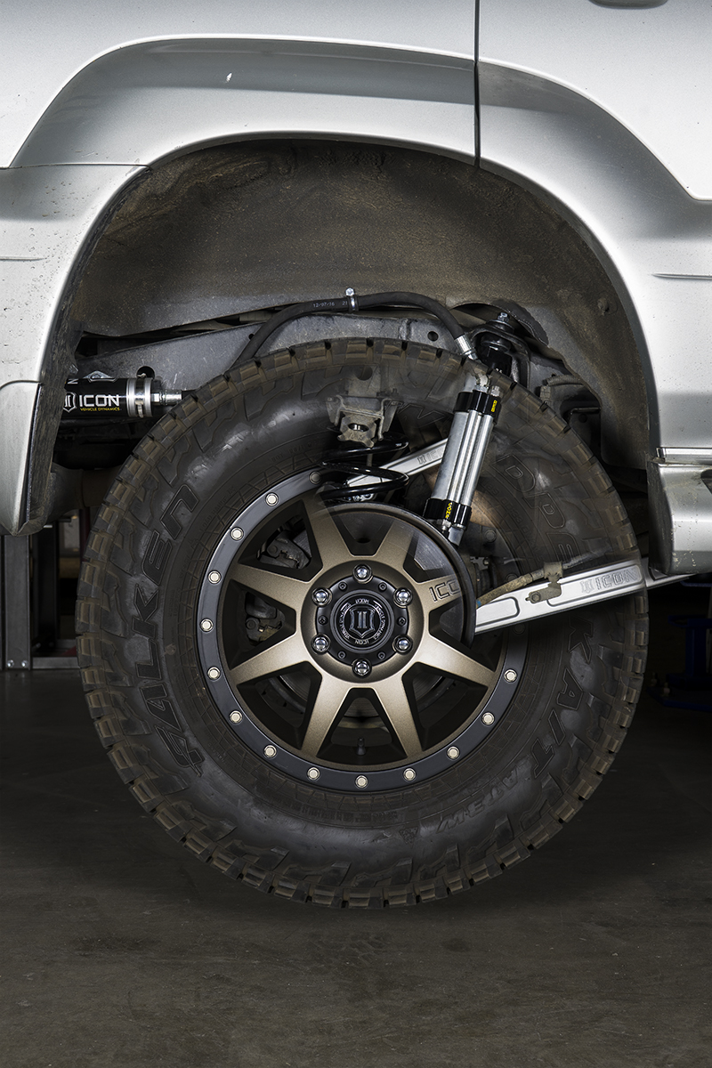 Since this build started with about 125k already on the clock, we knew the control arms could use a refresh. Aluminum arms were chosen for a few reasons, mainly their resistance to corrosion. Icon uses a double adjuster sleeve in their control arms to facilitate easy, on vehicle adjustments. Icon specs all FK brand, JM series rod ends in their arms with teflon lines, which are one of the highest grade rod ends available. By using a high quality teflon lined heim joint, most of the negatives attributes like noise and quick wear, are negated.