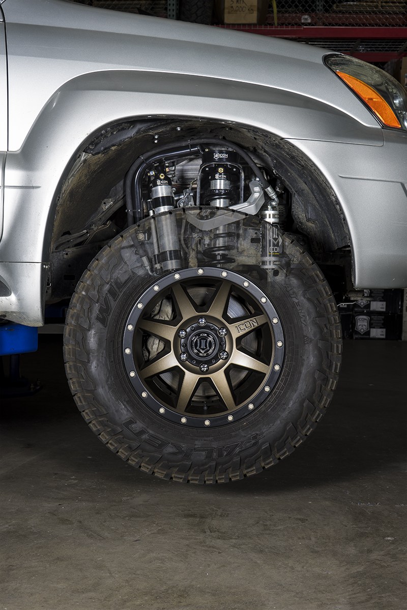 Not wanting to run the risk of ever being mistaken for a minivan in the Starbucks drive through ever again, the call was made to ‘go for it’. Being that the vehicle already had 120k on the clock, most of the suspension parts were ready for a refresh anyway, and with the main achilles heel of the GX platform being its expensive adjustable dampers and air suspension, we know this would be an easy transition to make. A full Stage 8 kit was put together with some small variations. The rear shocks were substituted for Omega bypasses, the Stage 3 S2 front bypass package added, and the remote reservoir coilovers were swapped for internal reservoir coilovers to keep packaging simpler and cleaner.
