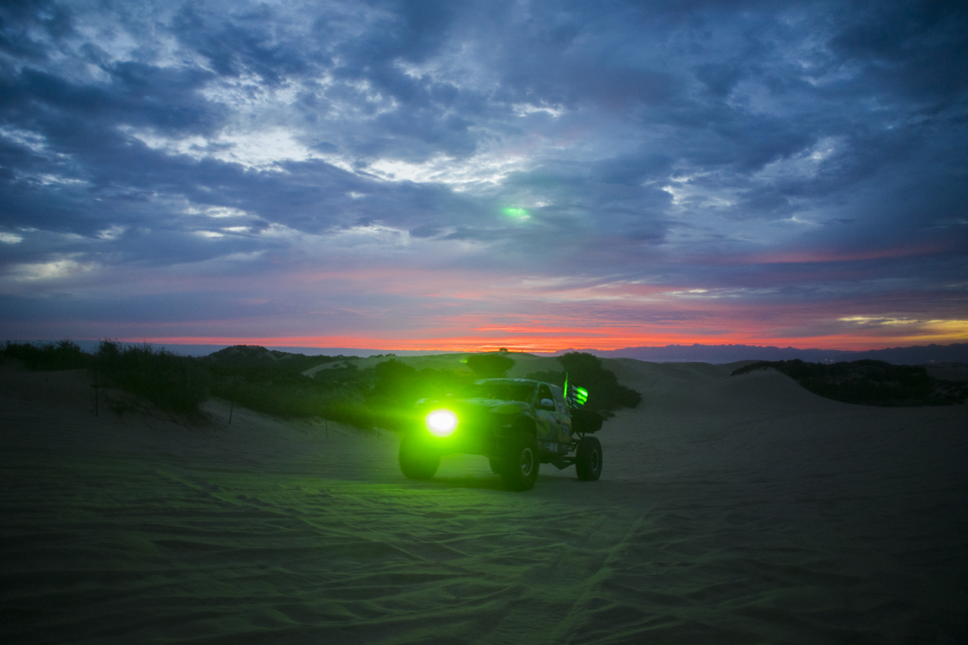 With a little light left before dark, we opted to play around a bit longer and see what we could catch with the cameras. Our GM borrowed his wife’s car, a Lexus GX470, for the evening and did a little high speed frolicking through a notorious whoop-de-doo section for the drone to capture, showing off how dialed Icon Vehicle Dynamics bolt on solutions are. With their S2 secondary shock front system, and Omega bypasses all around, there isn’t a speed bump at the mall that his wife can’t handle with supreme confidence. Kenny found a nice little hill to session in the last remaining light, and quickly decided that he needs far more motor if he wants to push his King Shocks to their true limits. Once the sun finally slipped below the horizon, the trip ended as quickly as it started and we all went our separate ways, waiting for the next group text that starts with that same old line….”Dude, we’re going to the beach!”