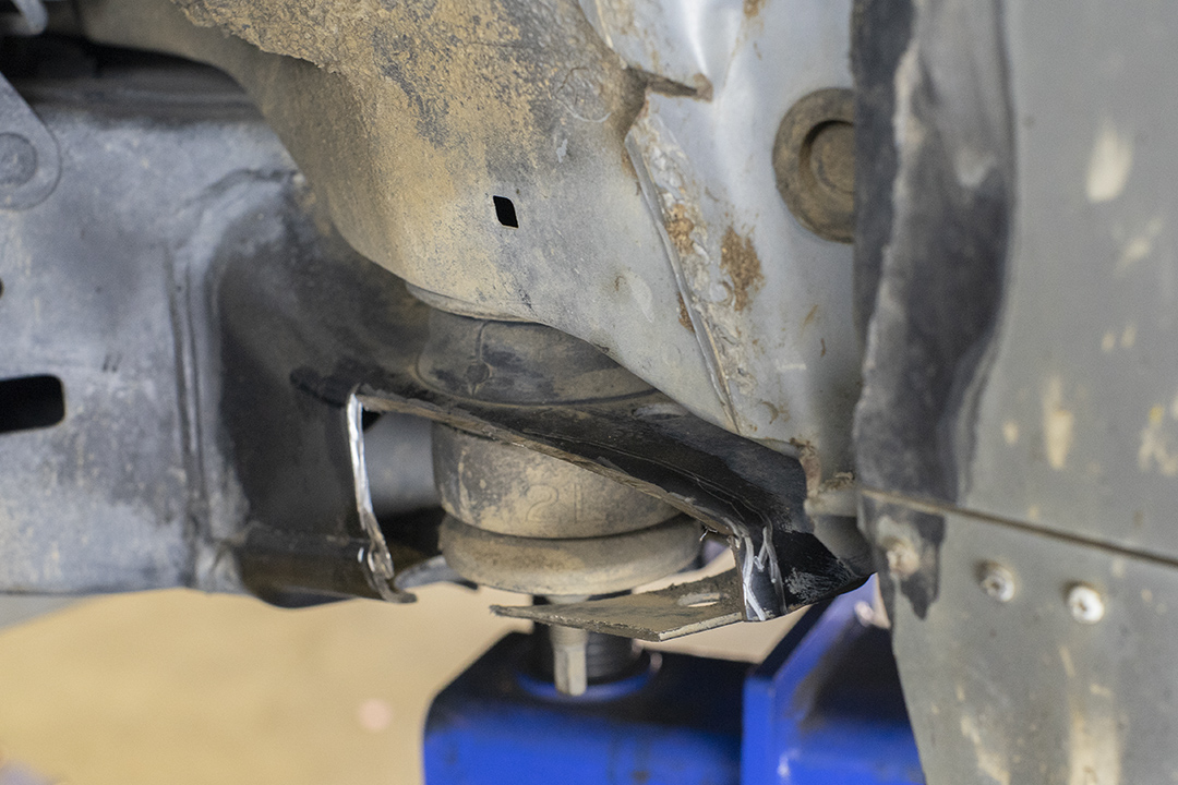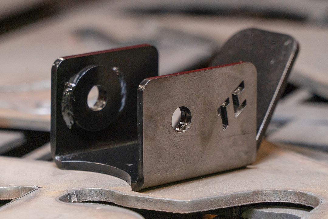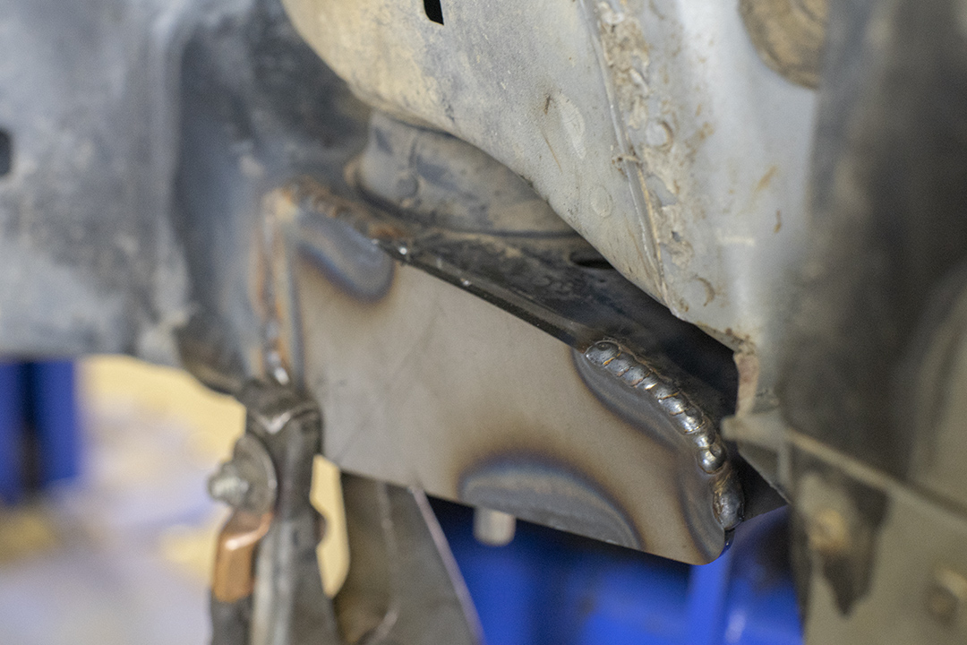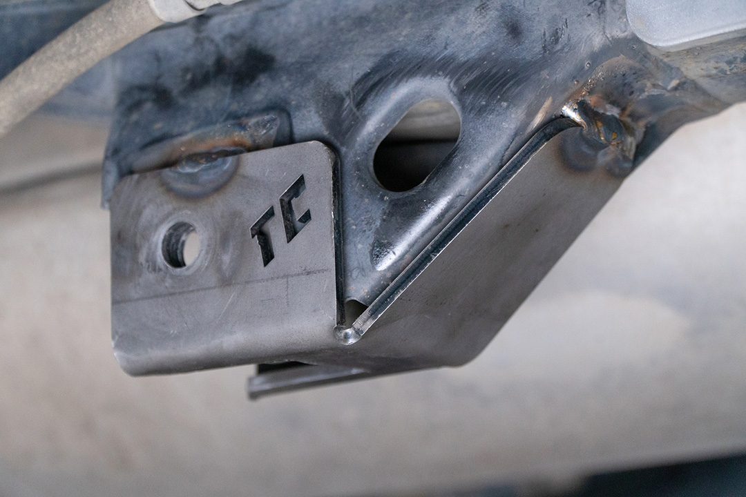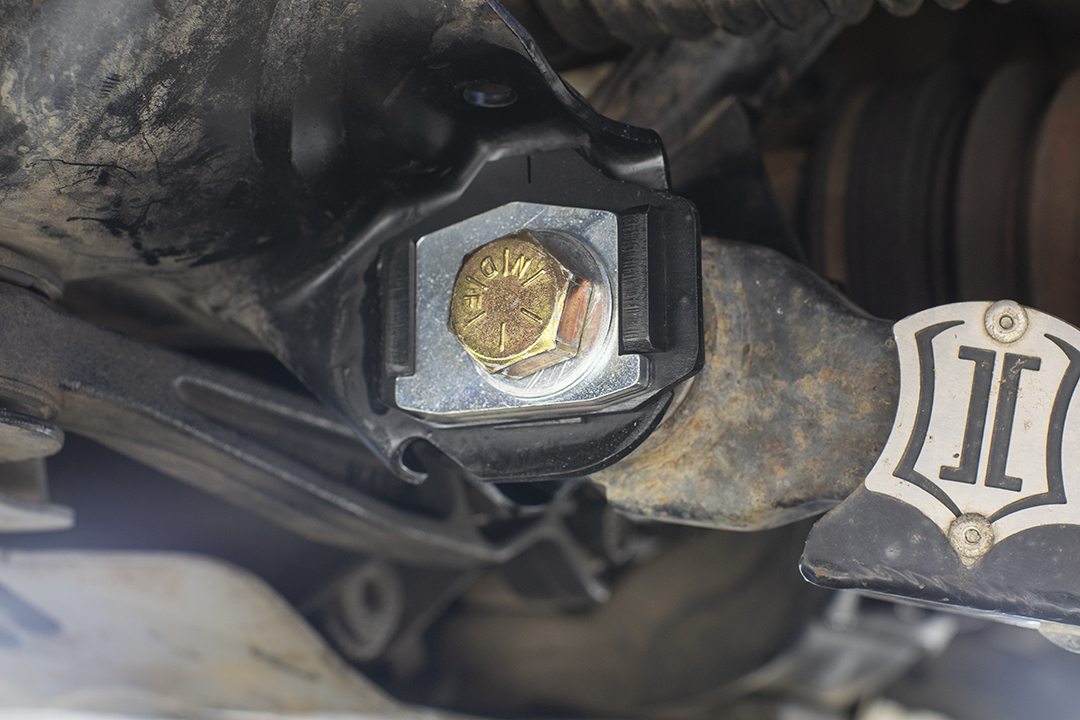 Moving to the rear end, there aren’t quite as many issues to address, but one common issue we hoped to avoid was ovalizing the lower control arm bolt holes. The factory brackets are very thin metal, and the lower arm sees a lot of load as it’s responsible for both managing torque loading and locating the rear axle. Total Chaos offers a great pair of link skids that reinforce this mount and add a lot of surface area to the locating hole for the bolts. We did have to trim these brackets a little to work with the huge set of rod ends that ICON specs for their rear lower links.