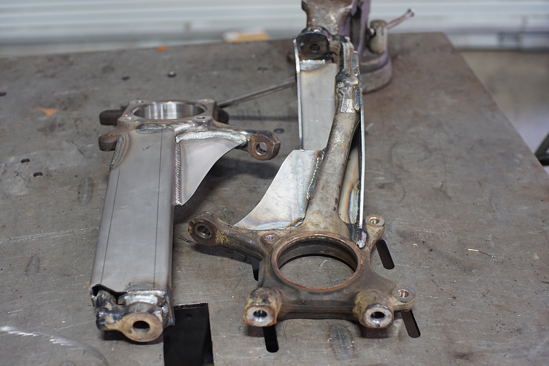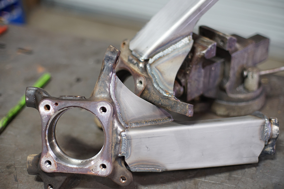Yet another known weak area in the front end of the 120-series platform is the steering knuckle, or sometimes called the spindle. While it’s certainly an improvement upon the earlier Tacoma and 4Runner setup, it still has a long thin arm that reaches up from the wheel bearing flange surface to the upper ball joint. Heavy use, jumping, or extra weight added in the form of armor and gear can all contribute to a failure of this part. Even a slight bend from a hard hit on one side is enough to ensure your alignment will never be in spec or even the same side to side. Total Chaos offers 2 separate gusset kits for this part: one that allows you to retain the factory sway bar, and a simpler one that omits a sway bar provision. We’ve installed both, but for most users we would recommend the sway bar specific gusset. It’s got a little extra meat, and having the option to still run a sway bar is nice, especially on daily drivers that may even see towing duties like our GX does. This gusset kit is a very in-depth install, even though it sounds simple. It requires the knuckles to come completely off and quite a bit of prep time to ensure proper weld penetration and alignment of the various pieces.