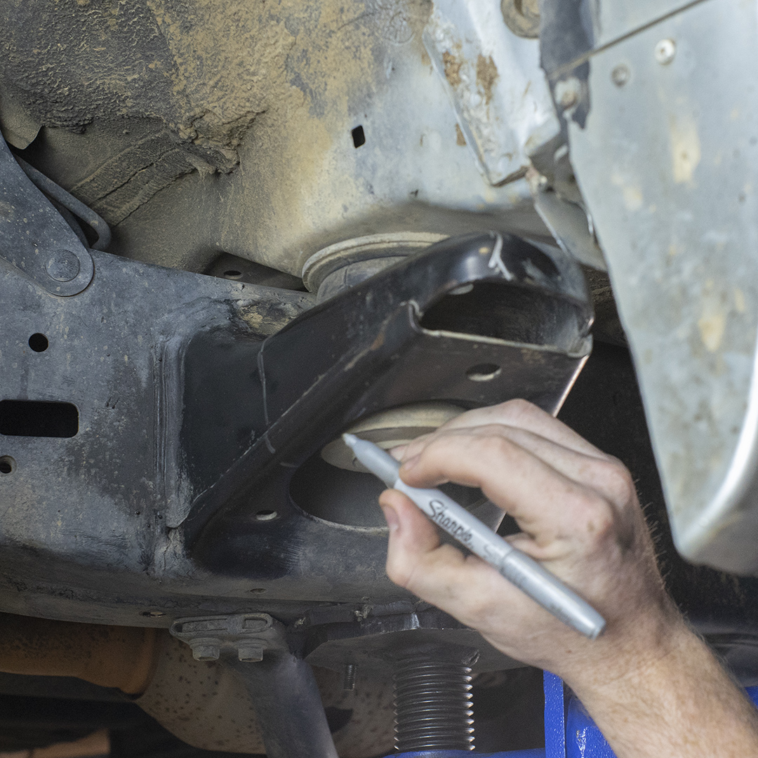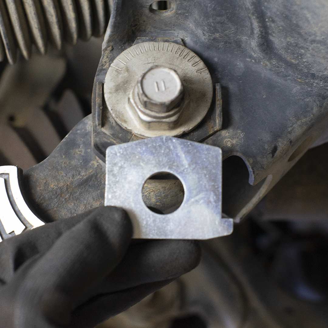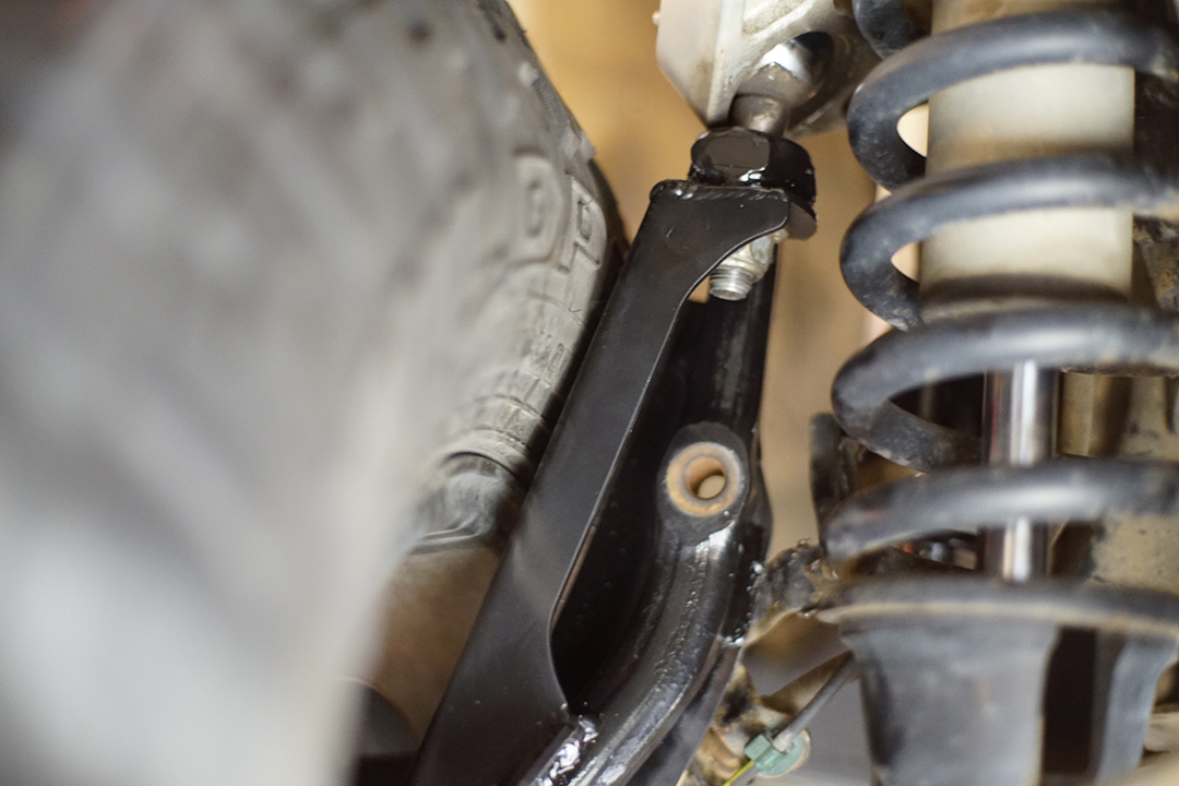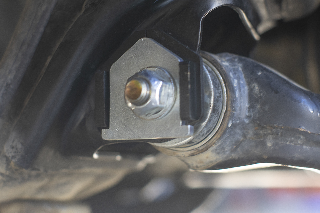 One of the most common issues with these trucks is maintaining alignment. The alignment is set from the factory using adjustable cams on the pivot points for the lower control arms. It’s a very simple and flexible solution that works well for street driven vehicles. Once the capability of the vehicle has been increased though, higher sustained speeds and harder impacts off road become common and several things happen. First, the bolts can rotate fairly easily; the only thing holding them in place is the torque on the cam. Under more extreme impacts the thin sheet metal tabs that the cams index off of can fold over easily as well (we’ve even seen reports of mis-informed shops hammering them over to align vehicles, which should never be done!). Luckily, there are a couple simple fixes!