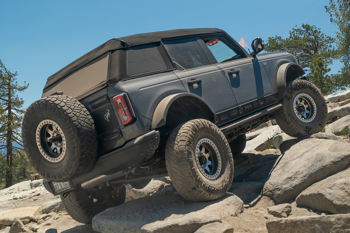 This was our first trip really testing out the Broncos capabilities since adding a bunch of new parts. We recently outfitted it with a Zone 2” Spacer Lift, Raceline Avenger Beadlock Wheels paired with 37” Nitto tires, and some steering beef consisting of JKS Tie Rod Sleeves and Zone Cam Tab Gussets. After our immediate mishap in Moab during the last EJS event, we were all apprehensive about the Broncos weak factory tie rods snapping once again. However, the recent upgrades and newly acquired spare parts gave us the confidence to lock the Bronco into the extreme level group which was directed to all the hardest obstacles Bald Mountain has to offer.