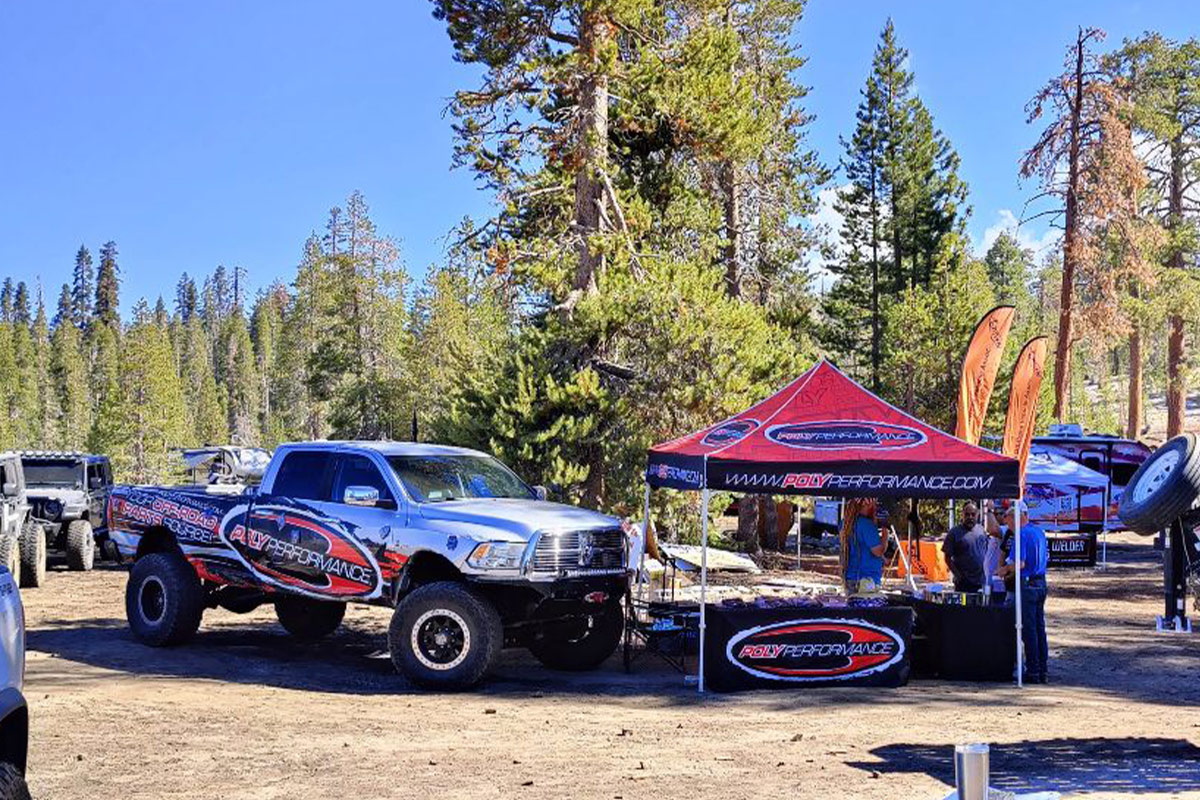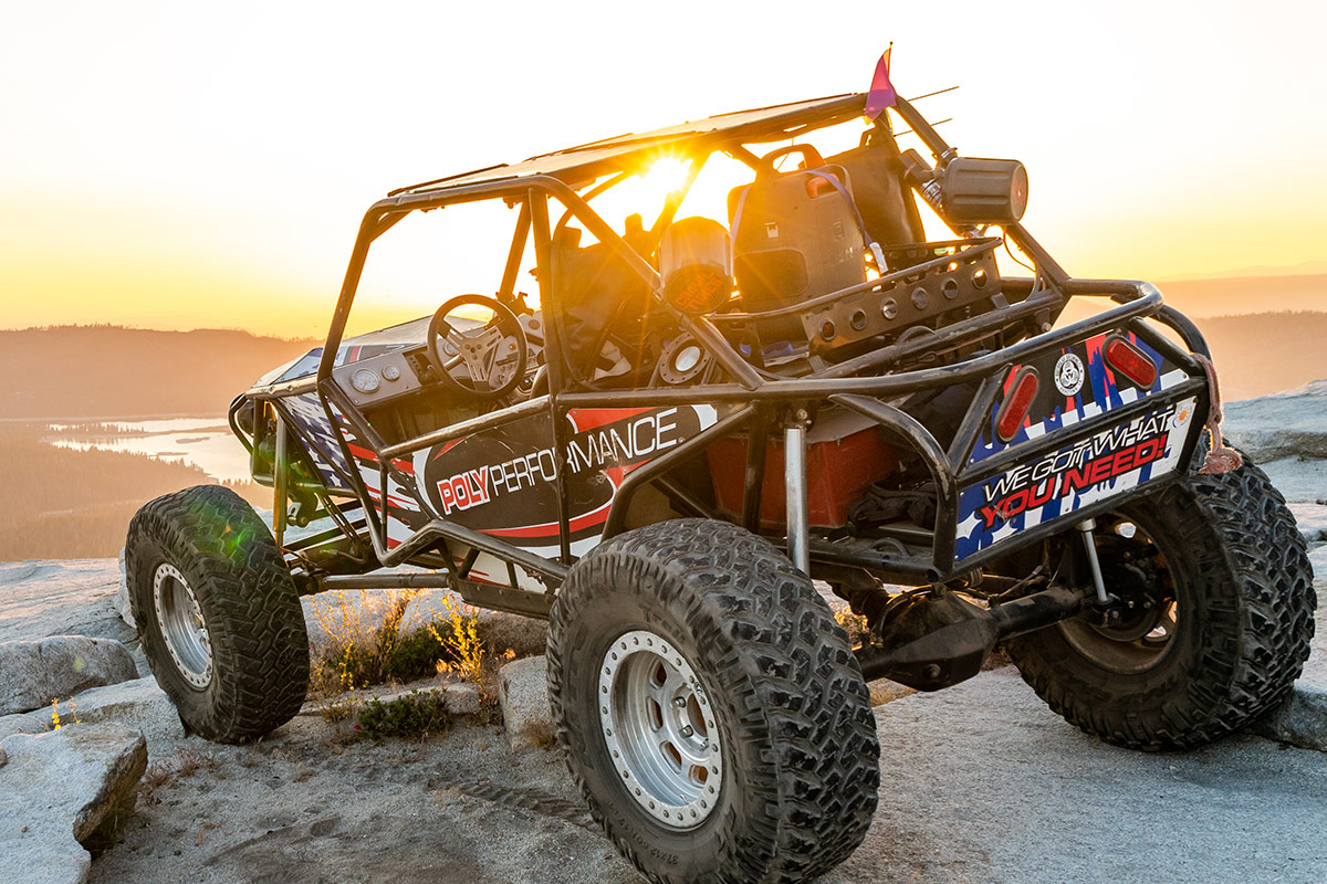 We hit the road early Friday morning, loading up our new Poly Performance Bronco, and the trusty Poly Buggy onto the back of our well-used Mega Dodge. We towed up the massive hill known as ‘4-Lanes’ without issue, navigating the twisty forest road up to our turnoff: Tamarack Sno-Park at an altitude of roughly 7,500ft. After a short section of dirt road, part of which intersects an endangered toad crossing, we made it to the staging area/vendor booths. After setting up our booth and checking in at the event, we got camp thrown up and headed out for a quick shakedown run up to the tower to watch the sun go down.